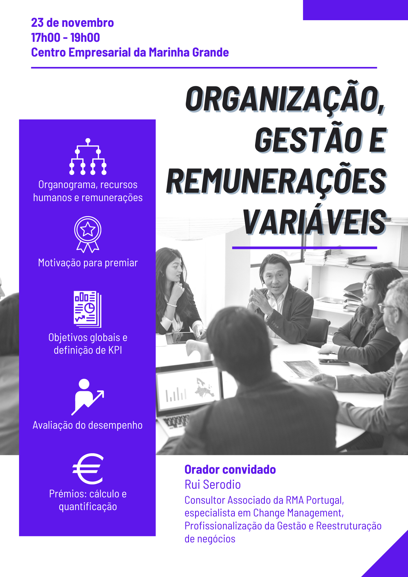 Com apresentação de Rui Serodio, Consultor Associado da RMA Portugal, serão abordados tópicos como a definição de KPI, avaliação do desempenho e cálculo e quantificação de prémios.