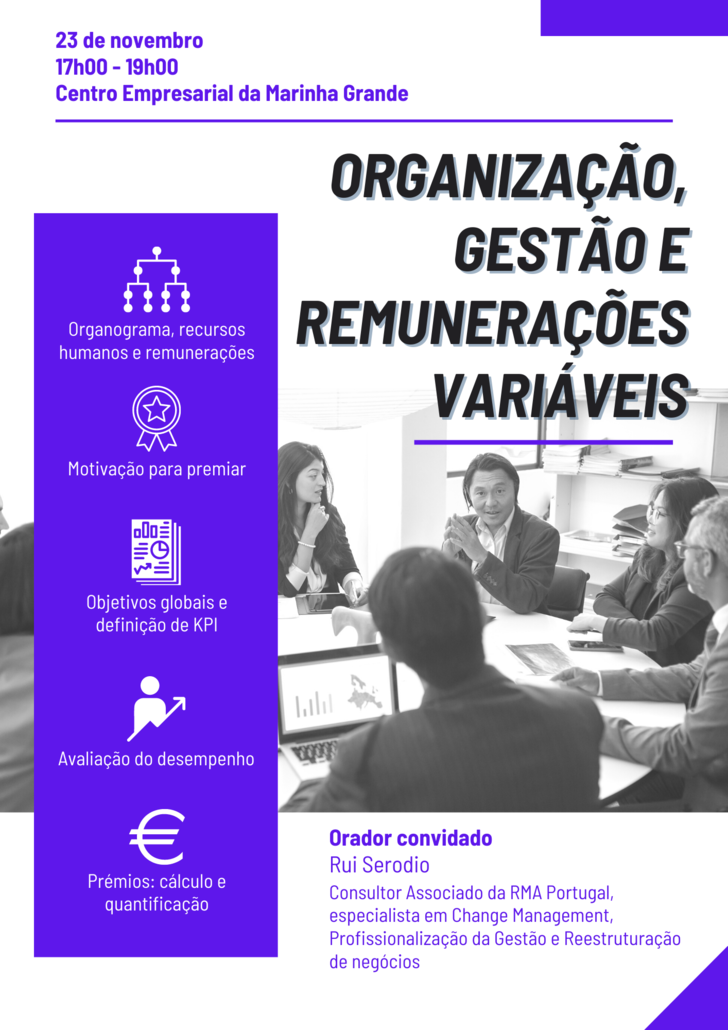 No dia 23 de novembro, entre as 17h00 e as 19h00, a CEFAMOL, com o apoio da RMA Portugal, realiza a sessão «Organização, gestão e remunerações variáveis», no Centro Empresarial da Marinha Grande.