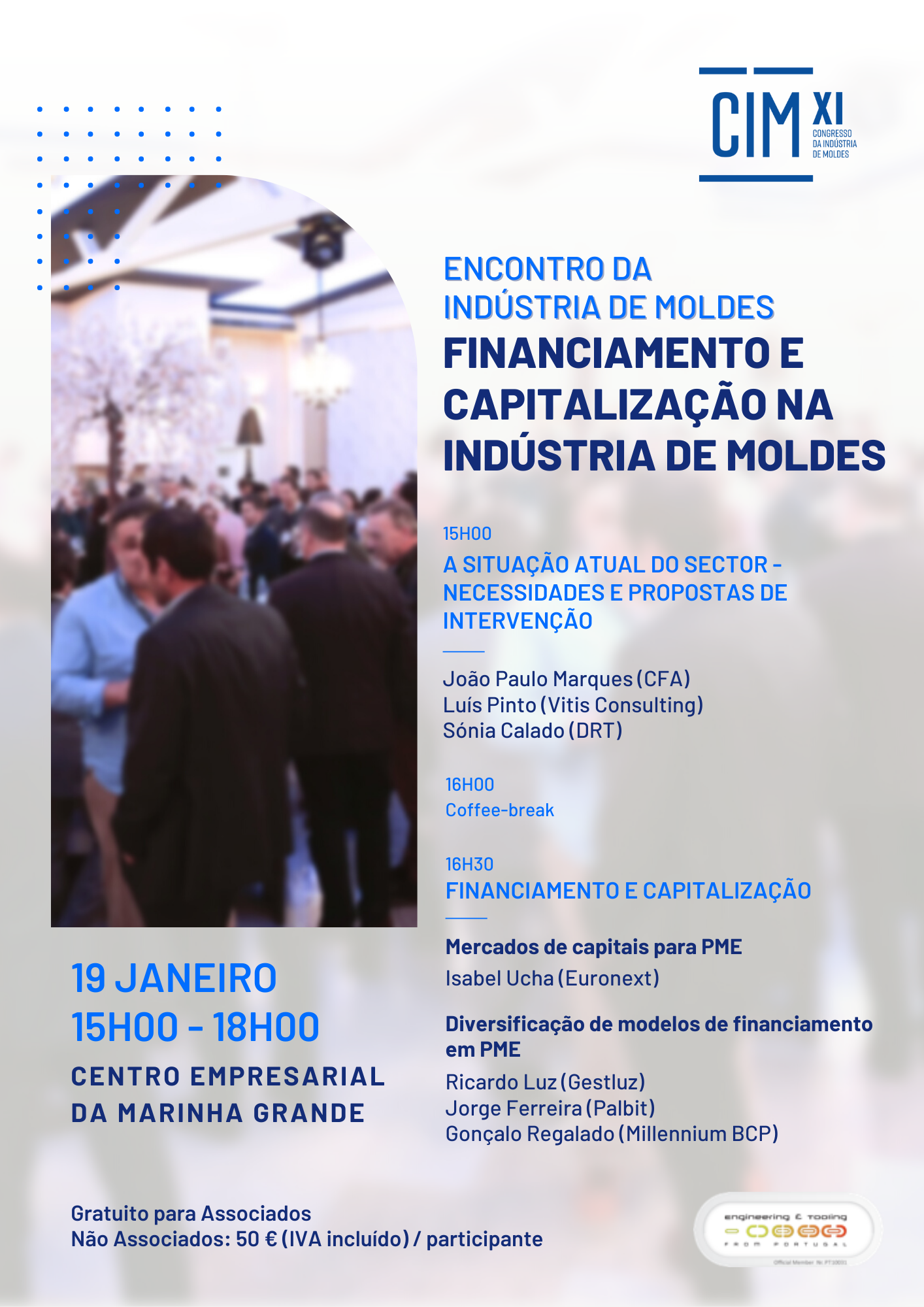 A primeira sessão, «Financiamento e Capitalização na Indústria de Moldes», decorrerá a 19 de janeiro, na Marinha Grande, entre as 15h00 e as 18h00. Será debatida a situação atual do sector quanto a modelos de negócio e capitalização de empresas, assim como o acesso a mercados de capitais e a diversificação de fontes e modelos de financiamento para PME.