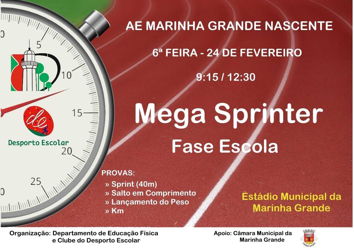 Na próxima sexta-feira, 24 de fevereiro, entre as 9h15 e as 12h30, tem lugar o Mega Sprinter - Fase Escola, do Agrupamento de Escolas Marinha Grande Nascente, no Estádio Municipal da Marinha Grande.