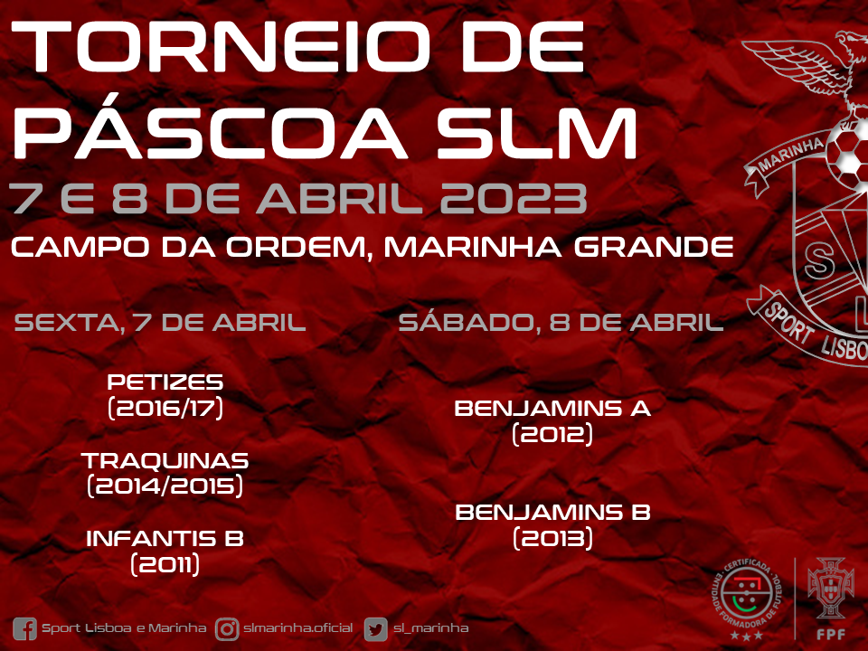 A 7 e 8 de abril decorre o Torneio de Páscoa Sport Lisboa e Marinha. Com início às 09h00, o evento tem lugar no Campo de jogos do Sport Lisboa e Marinha, na Ordem, Marinha Grande.