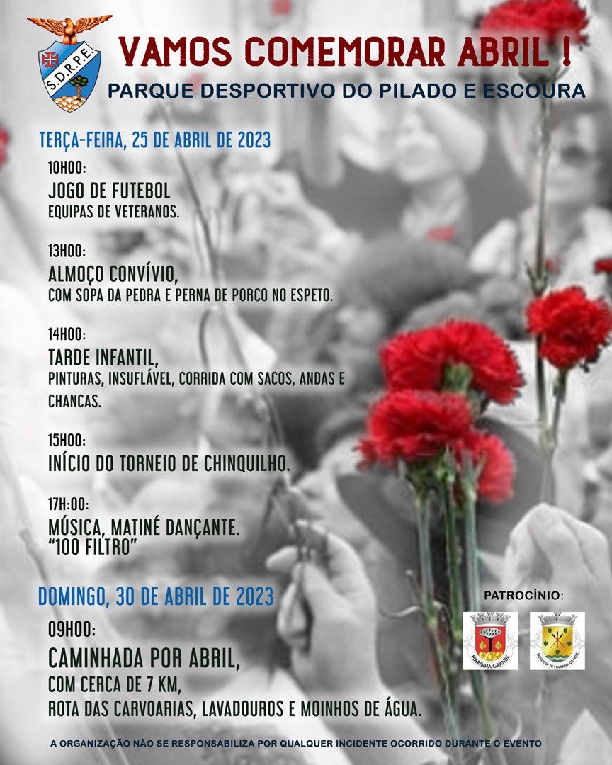 A Sociedade Desportiva e Recreativa Pilado e Escoura dinamiza diversas iniciativas no âmbito das comemorações do 25 de Abril, no Parque Desportivo do Pilado e Escoura.