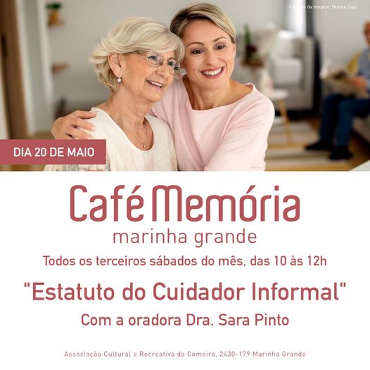 A segunda sessão do Café Memória Marinha Grande decorre no dia 20 de maio às 10h00 na sede da Associação Cultural e Recreativa da Comeira e terá o tema: "Vamos falar sobre o Estatuto do Cuidador Informal", com a oradora Dra. Sara Pinto.