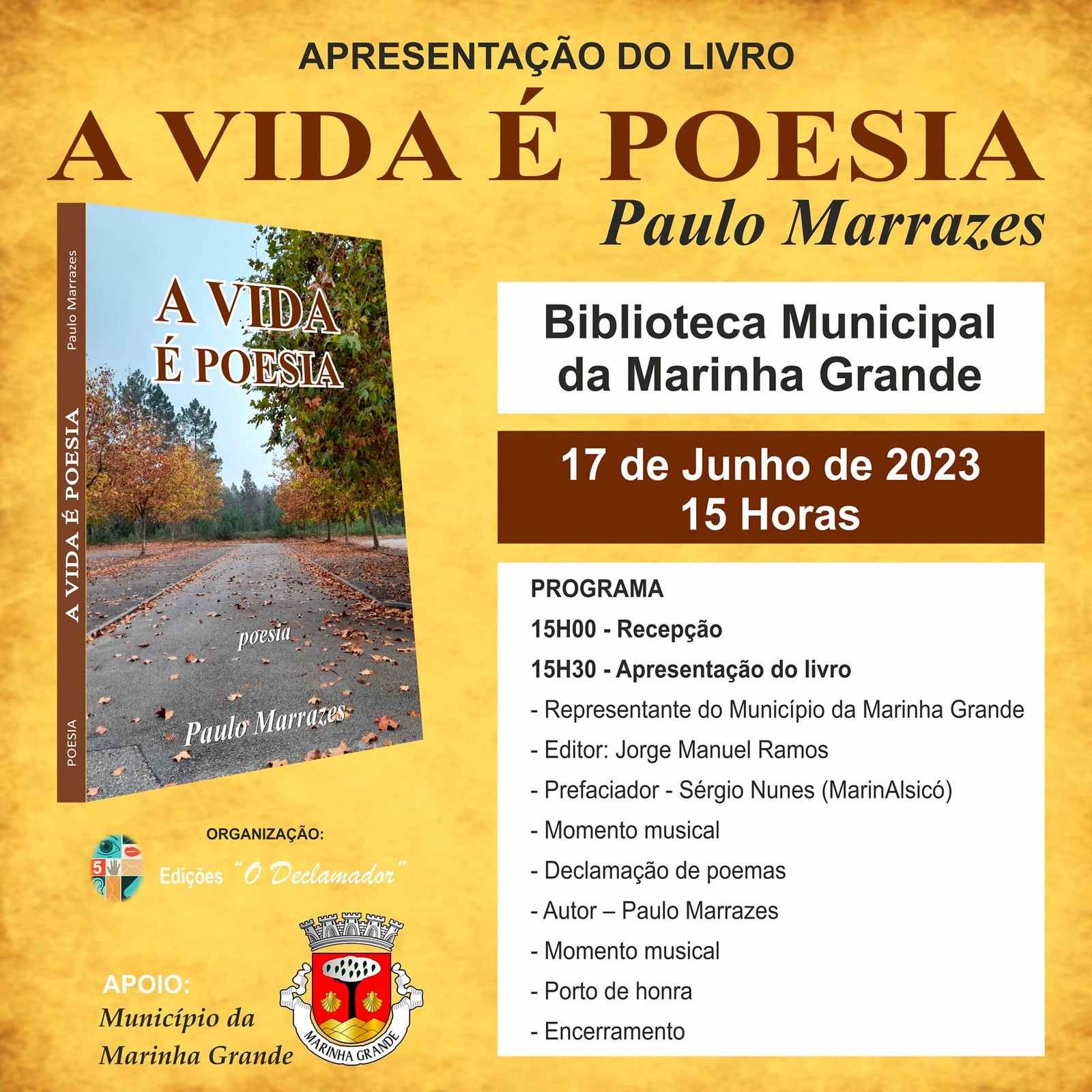 O Auditório da Biblioteca Municipal da Marinha Grande, situado no Jardim Stephens, recebe a apresentação do livro de poesia “A vida é poesia”, da autoria do escritor marinhense Paulo Marrazes, no dia 17 de junho (sábado), pelas 15h30, que conta com o apoio do Município.