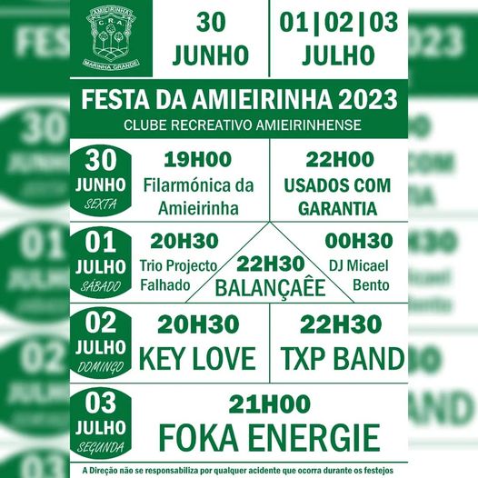 A 30 de junho, 1, 2 e 3 de julho acontece a Festa da Amieirinha 2023, no Clube Recreativo Amieirinhense, que contará com música, comida, bebida e bastante diversão.