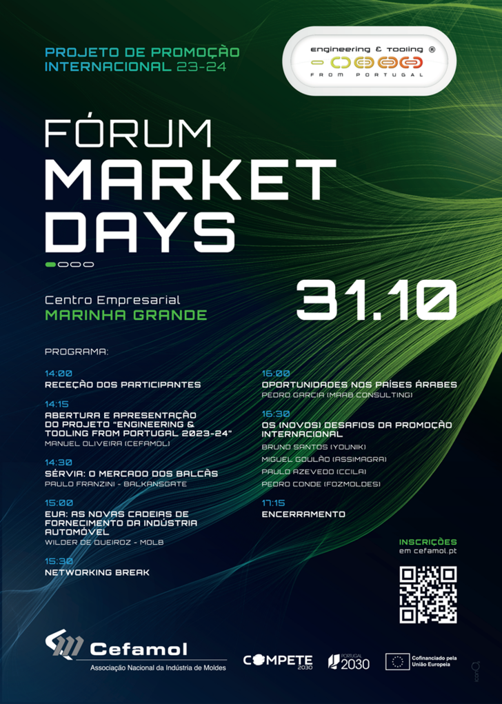 No âmbito do seu projeto de promoção internacional “Engineering & Tooling from Portugal”, a CEFAMOL organiza no próximo dia 31 de outubro o evento Market Days dedicado à análise e debate de oportunidades para o alargamento da base exportadora do sector.
