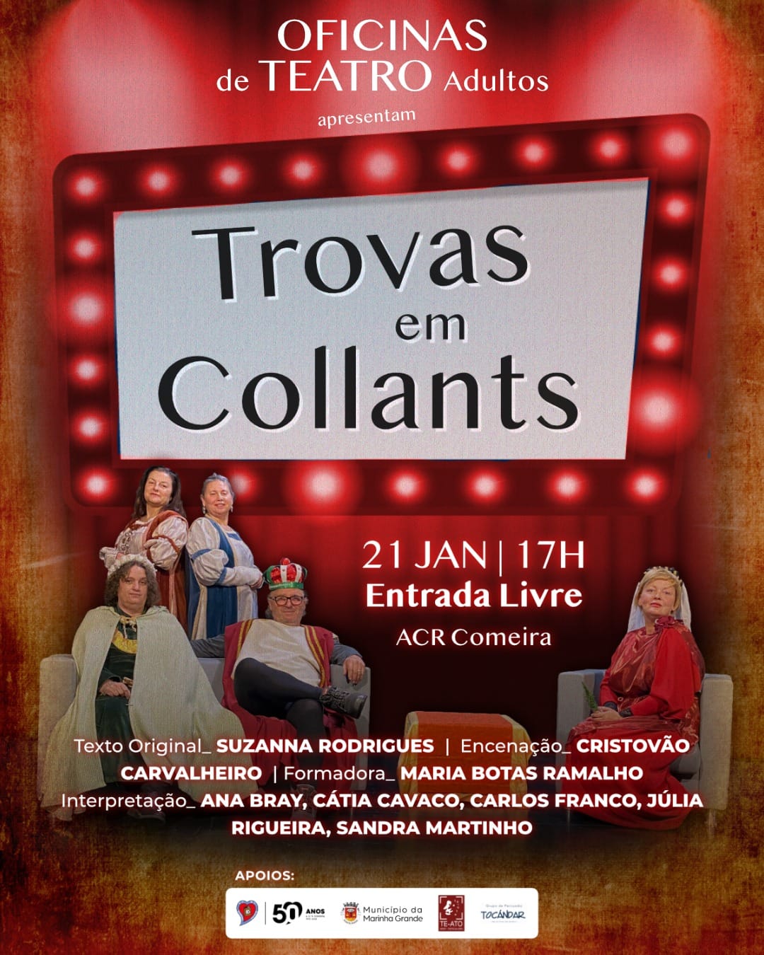 Apoios: ACR Comeira, Município da Marinha Grande, Te-Ato - Grupo Teatro de Leiria, Tocándar, Junta de Freguesia da Marinha Grande