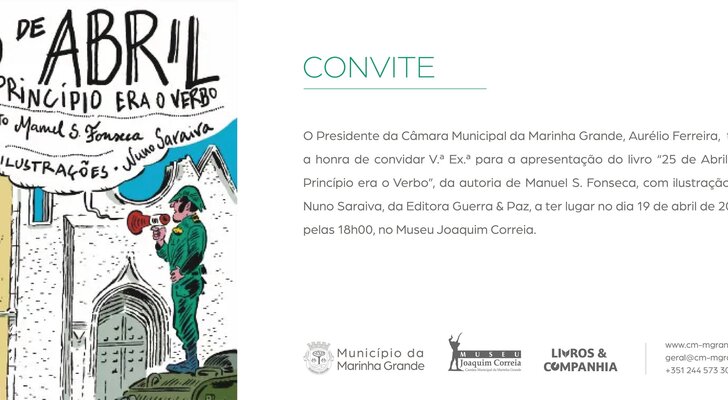 O Museu Joaquim Correia, na Marinha Grande, recebe a apresentação do livro “25 de Abril, no Princípio Era o Verbo”, da autoria de Manuel S. Fonseca, ilustração de Nuno Saraiva, da Editora Guerra & Paz, a ter lugar no dia 19 de abril, pelas 18h00.