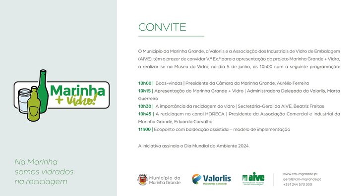 O Município da Marinha Grande, em parceria com a Valorlis e a AIVE (Associação dos Industriais de Vidro de Embalagem), vai comemorar o Dia Mundial do Ambiente com a apresentação pública do projeto “Marinha Grande + Vidro”, que decorrerá no dia 5 de junho, às 10h00, no Museu do Vidro.