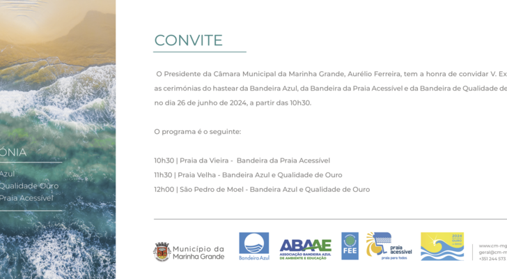 O Município da Marinha Grande vai realizar as cerimónias do hastear da Bandeira Azul, Bandeira Qualidade Ouro e Bandeira Praia Acessível, no próximo dia 26 de junho de 2023 (quarta-feira), a partir das 10h00, na Praia da Vieira, Praia Velha e São Pedro de Moel.