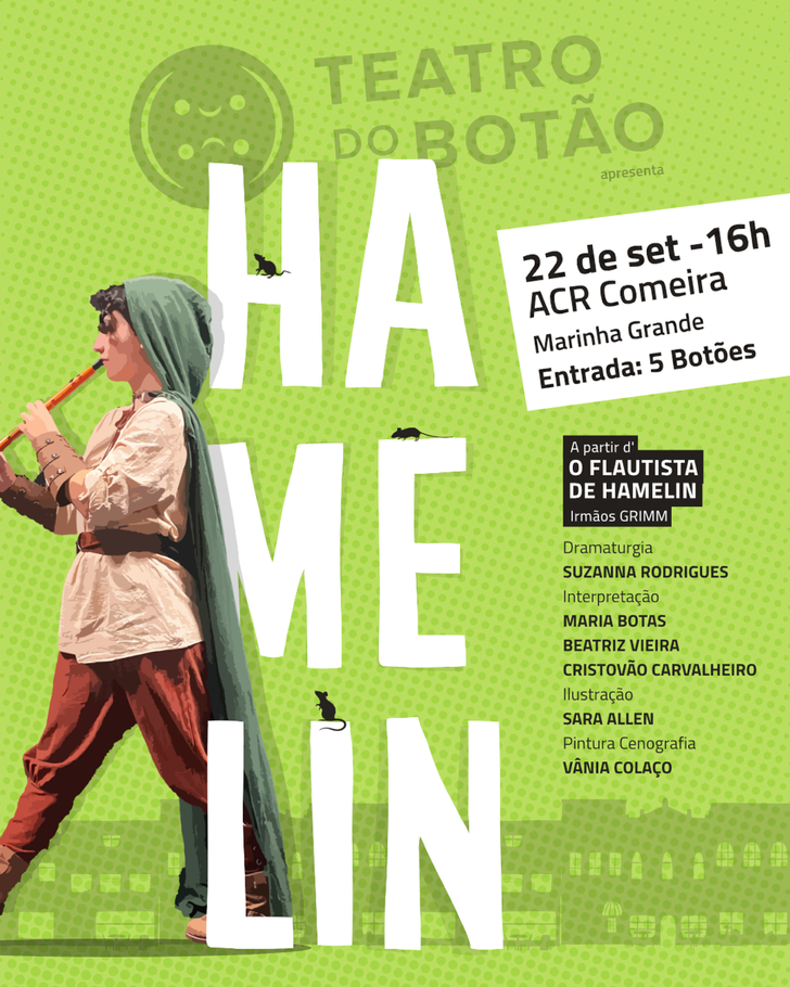 Dia 22 de Setembro, pelas 16h, o Teatro do Botão dá início à digressão letiva com a estreia do espetáculo “HAMELIN”, criado a partir do conto dos Irmãos Grimm, no auditório da ACR Comeira.