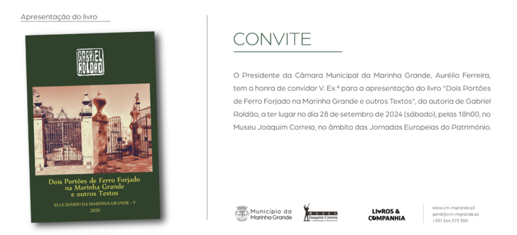 O Museu Joaquim Correia, na Marinha Grande, recebe a apresentação do livro “Dois Portões de Ferro Forjado na Marinha Grande e outros Textos”, de Gabriel Roldão, no próximo dia 28 de setembro, às 18h00, no âmbito das Jornadas Europeias do Património.
