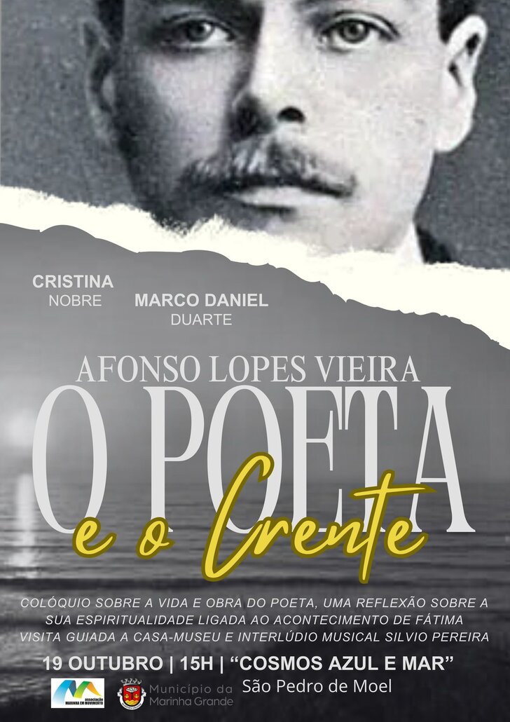 A Associação Marinha em Movimento convida a comunidade a participar num colóquio único sobre a vida e obra de Afonso Lopes Vieira, intitulado "Afonso Lopes Vieira: o Poeta e o Crente", que terá lugar no próximo dia 19 de outubro, às 15h, em São Pedro de Moel, no histórico Cosmos Azul e Mar, com uma visita guiada à casa do poeta.