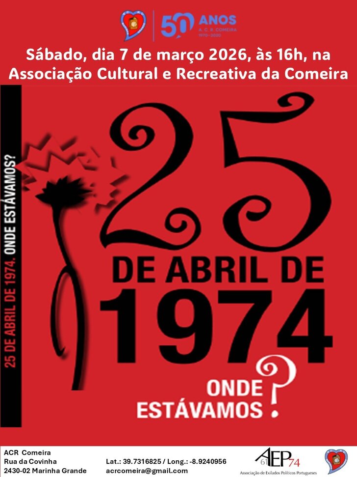 Apresentação do livro 25 de Abril de 1974, Onde Estávamos? Sábado, dia 7 de março 2026, às 16h, na Associação Cultural e Recreativa da Comeira, R DA COVINHA,2430-17919, MARINHA GRANDE, LEIRIA, Antes da sessão, pelas 13 horas, realizar-se-á um almoço de confraternização.
