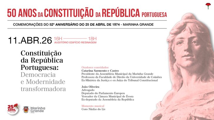 O Município da Marinha Grande promove, no próximo dia 11 de abril de 2026, uma sessão comemorativa dos 50 anos da Constituição da República Portuguesa, integrada nas Comemorações do 52.º Aniversário do 25 de Abril de 1974, que terá lugar no Auditório do Edifício da Resinagem, às 16h00.