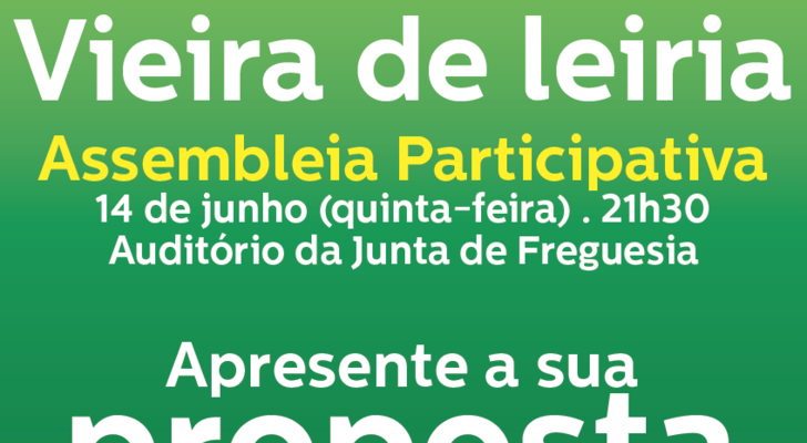 No dia 14 de junho (quinta-feira), pelas 21h30, no Auditório da Junta de Freguesia de Vieira de Leiria, realiza-se uma assembleia participativa, no âmbito do Orçamento Participativo 2018, cuja entrada é livre.