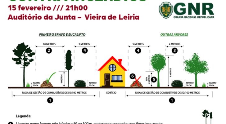 O Auditório da Junta de Freguesia de Vieira de Leiria recebe uma ação de sensibilização no âmbito da defesa da floresta contra incêndios, no dia 15 de fevereiro (sexta-feira), pelas 21h00, dirigida a toda a população da freguesia.