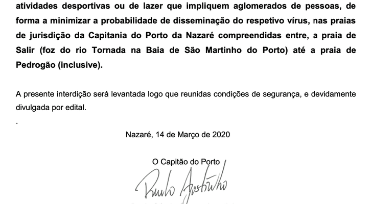 Comunicado da Autoridade Marítima Nacional - Capitania do Porto da Nazaré em que se interditam todas atividades desportivas ou de lazer que impliquem aglomerados de pessoas em todas as praias do nosso concelho.