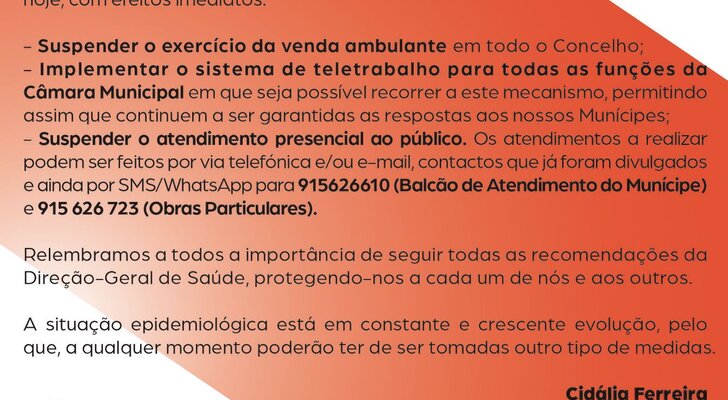 "Tendo presente a crescente evolução epidemiológica, o acompanhamento e monitorização constante do Plano de Contingência para o COVID-19, bem como a salvaguarda da saúde e bem estar dos nossos Munícipes, decidiu-se hoje, com efeitos imediatos: