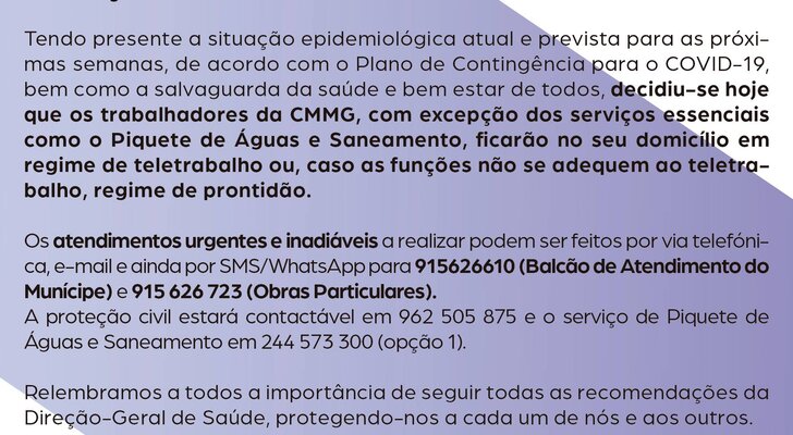 Tendo presente a situação epidemiológica atual e prevista para as próximas semanas, de acordo com o Plano de Contingência para o COVID-19, bem como a salvaguarda da saúde e bem estar de todos, decidiu-se hoje que os trabalhadores da CMMG, com excepção dos serviços essenciais como o Piquete de Águas e Saneamento, ficarão no seu domicílio em regime de teletrabalho ou, caso as funções não se adequem ao teletrabalho, regime de prontidão.