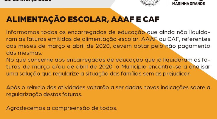Informamos todos os encarregados de educação que ainda não liquidaram as faturas emitidas de alimentação escolar, AAAF ou CAF, referentes aos meses de março e abril de 2020, devem optar pelo não pagamento das mesmas.