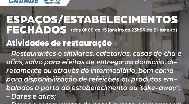 O decreto 3-A/2021 da Presidência do Conselho de Ministros que regulamenta o novo estado de emergência devido à pandemia da covid-19, em vigor entre as 00:00 de dia 15 de janeiro e as 23:59 de 30 de janeiro, determina o encerramento de espaços e estabelecimentos comerciais.