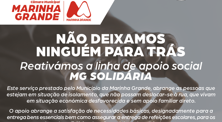 Como forma de combate ao isolamento e para garantir que quem mais precisa continua a ter apoio, a Câmara Municipal da Marinha Grande reativa hoje, 15 de janeiro de 2021, o programa de apoio social assente na linha MG Solidária.