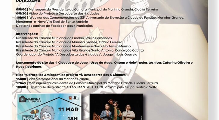 O programa conta com a participação das quatro cidades irmãs de Marinha Grande, Fundão, Montemor-o-Novo e Vila Real de Santo António, através de um webinar que terá a participação dos respetivos presidentes de Câmara. O programa da Marinha Grande incluiu ainda a transmissão da mensagem da Presidente Cidália Ferreira, de videos do concelho e de uma peça de teatro.