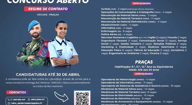 A Força Aérea tem abertos concursos de admissão ao Curso de Formação de Oficiais e ao Curso de Formação de Praças, do Regime de Contrato, para efetuar uma incorporação em junho do corrente ano.