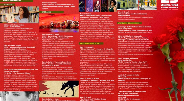 Será apresentado um programa transversal, para adultos e crianças, desde a leitura de um conto infantil, à música, com a transmissão do concerto da reconhecida cantora Teresa Salgueiro (ex-Madredeus), um concerto itinerante pelas ruas da cidade com a atuação de artistas marinhenses e outras atividades paralelas de destaque, como Corridas Virtuais e um Concurso de Fotografia, passando por visitas aos museus municipais, não esquecendo os habituais momentos evocativos de Abril, com o intuito de viver e recordar uma data tão importante como esta.