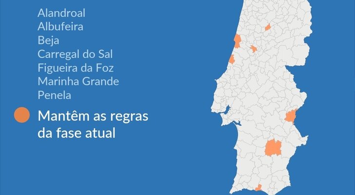 Nesta categoria, estão os concelhos que, pela segunda avaliação quinzenal consecutiva, se encontram com uma taxa de incidência superior a 120 casos por 100 mil habitantes nos últimos 14 dias. Assim, são sete os concelhos que irão permanecer na segunda fase do plano de desconfinamento: Alandroal, Albufeira, Beja, Carregal do Sal, Figueira da Foz, Marinha Grande e Penela. Assim, as medidas que vão continuar em vigor nestes concelhos são as seguintes: