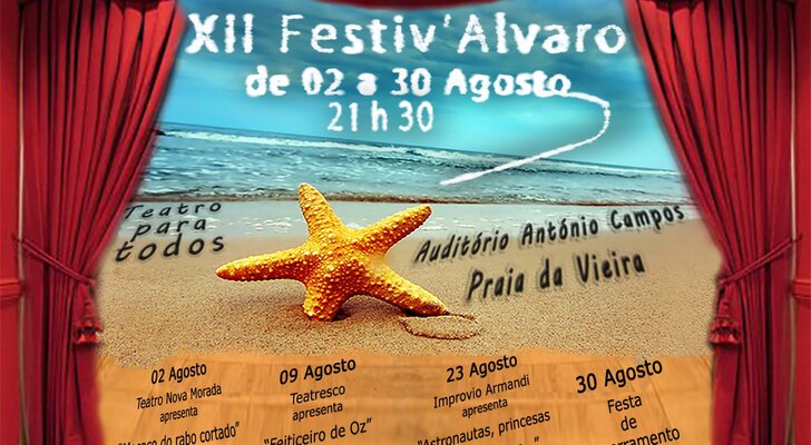 A Praia da Vieira acolhe mais o XII Festiv’ Álvaro – Festival de Teatro, no Auditório António Campos, situado na Avenida dos Pescadores, durante o mês de agosto. A iniciativa é organizada pelo Teatresco - Grupo de Teatro, com o apoio da Câmara Municipal da Marinha Grande.