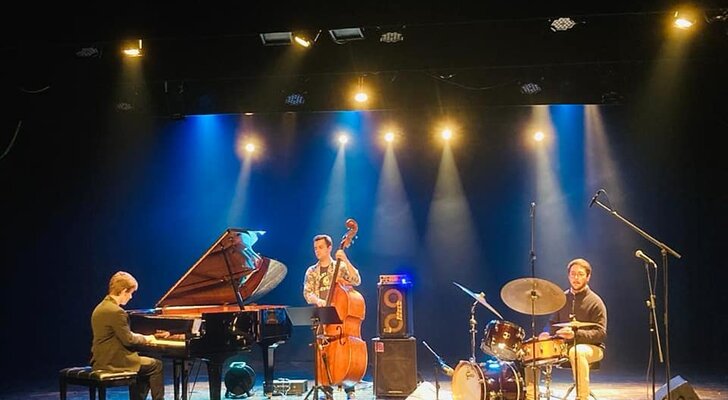 Os outros dois elementos da banda, Hugo Lobo, no piano, e Rodrigo Correia, no contrabaixo, também são alunos da ESML e são todos excelentes músicos.