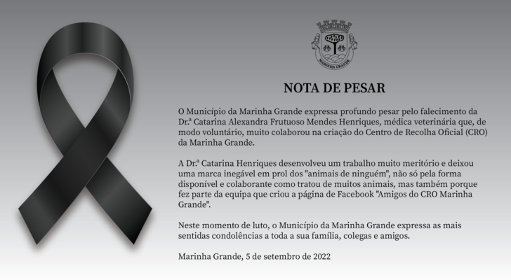 O Município da Marinha Grande expressa profundo pesar pelo falecimento da Dr.ª Catarina Alexandra Frutuoso Mendes Henriques, médica veterinária que, de modo voluntário, muito colaborou na criação do Centro de Recolha Oficial (CRO) da Marinha Grande.