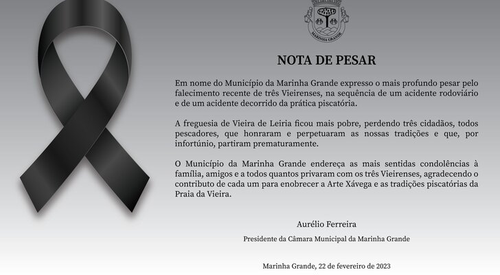 Em nome do Município da Marinha Grande expresso o mais profundo pesar pelo falecimento recente de três Vieirenses, na sequência de um acidente rodoviário e de um acidente decorrido da prática piscatória.