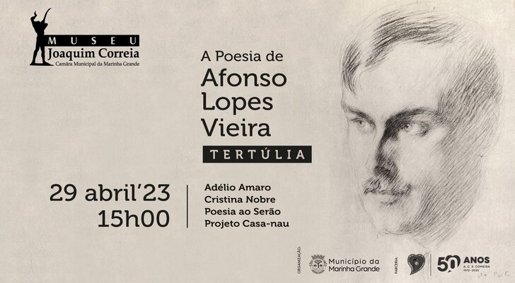 O Museu Joaquim Correia realiza a Tertúlia “A poesia de Afonso Lopes Vieira”, no próximo sábado, 29 de abril de 2023, pelas 15h00, numa organização do Município da Marinha Grande e da Associação Cultural e Recreativa da Comeira, cuja entrada é gratuita.