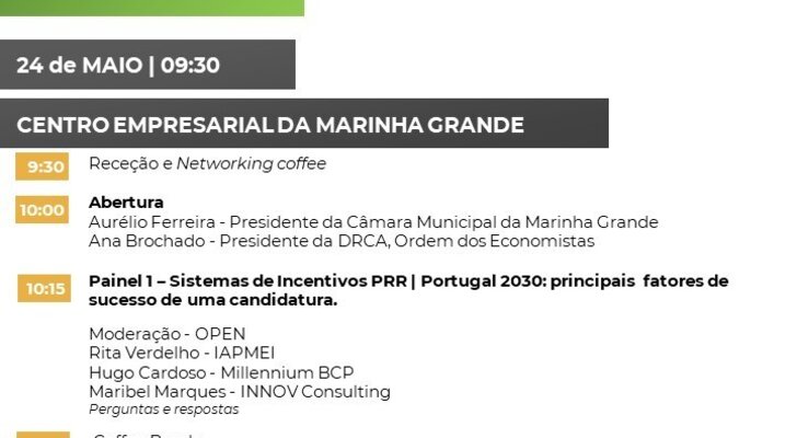 No âmbito do Portugal 2030 e do Plano de Recuperação e Resiliência (PRR), tem lugar, a 24 de maio, a partir das 9h30, a conferência "Sistemas de Incentivos à Competitividade Empresarial", no Centro Empresarial da Marinha Grande.