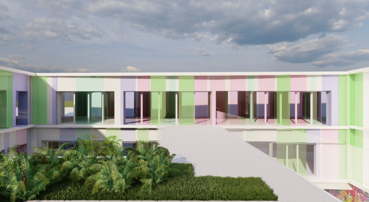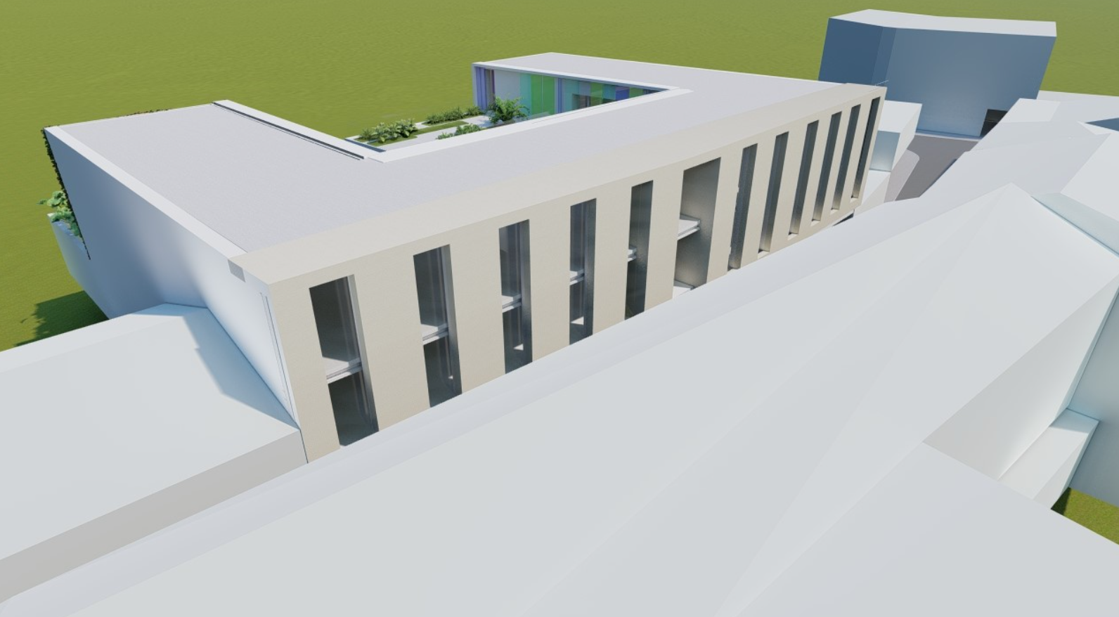 Propõe-se uma segunda fachada interior com relação ao pátio, num jogo de vidro de cores, que fará uma ligação com a origem da Marinha Grande e a Indústria vidreira e dará um ar juvenil ao espaço.