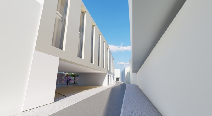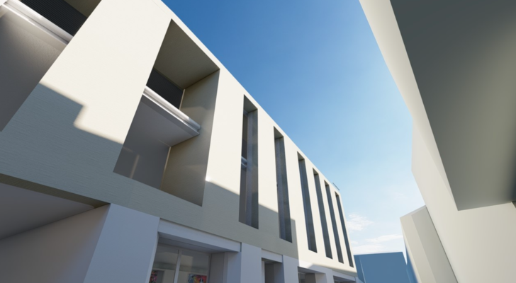 Por trás e a partir da fachada da antiga Albergaria Nobre prevê-se um plano envidraçado, marcado pela verticalidade da fachada pré-existente e da estrutura metálica presente na nova edificação. Em relação à forma do edificado, será potenciado o convívio social, através de um pátio interno exterior, aberto à comunidade marinhense.