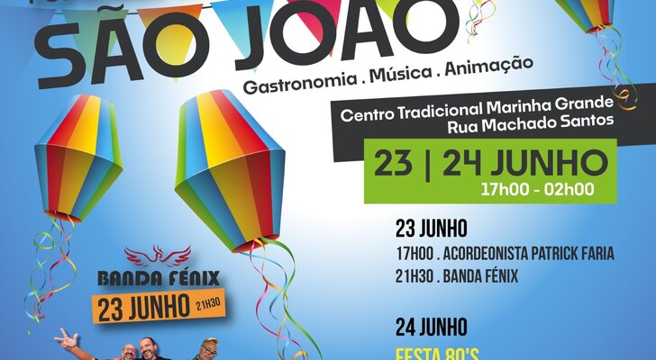 A Marinha Grande recebe as Festas Populares de São João, nos dias 23 e 24 de junho, das 17h00 às 02h00, na Rua Machado Santos, com o objetivo de dinamizar o comércio do centro da cidade, através de gastronomia, artistas populares e atuação de DJ’s.