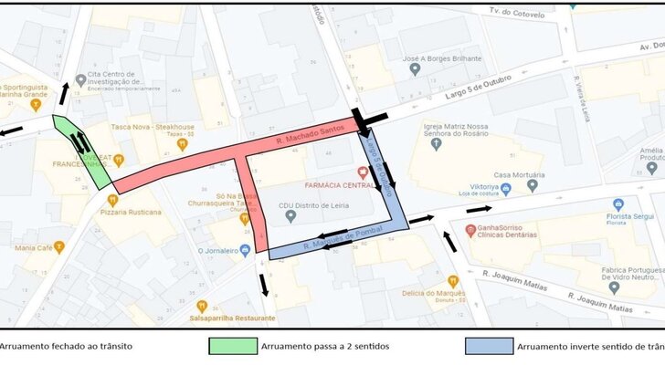 O trânsito proveniente da Avenida D. Dinis será dirigido para o corte à esquerda no Largo 5 de outubro. A Rua Marquês de Pombal passa a inverter o sentido da marcha entre o Banco Millennium e a sede do Partido Comunista Português. O Trânsito estará cortado da Rua Machado Santos até ao cruzamento com a Rua Dr. Pedro Viana e, na Rua António Campos Júnior. A Rua Dr. Pedro Viana passa a ser de 2 sentidos entre o Restaurante “I love eat Francesinhas” e o Núcleo Sportinguista da Marinha Grande.