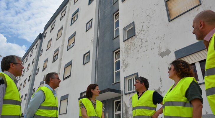 O presidente da Câmara, Aurélio Ferreira, e os vereadores com pelouros Ana Alves Monteiro, João Brito, Ana Laura Baridó e António Fragoso iniciaram a visita às intervenções de manutenção e beneficiação de blocos de habitação social localizados em Casal de Malta, com substituição de coberturas e reabilitação energética do edificado.