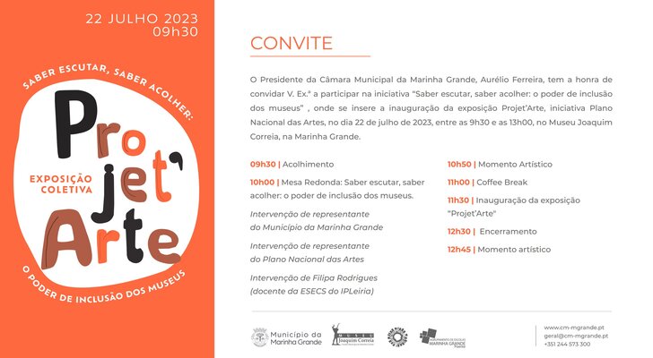 O Museu Joaquim Correia, na Marinha Grande, vai realizar a iniciativa “Saber escutar, saber acolher: o poder de inclusão dos museus”, que integra um momento de intervenções dedicadas ao tema da Inclusão nos Museus e a inauguração da exposição “Projet’Arte", no dia 22 de julho de 2023 (sábado), das 09h30 às 13h00, cuja entrada é gratuita.