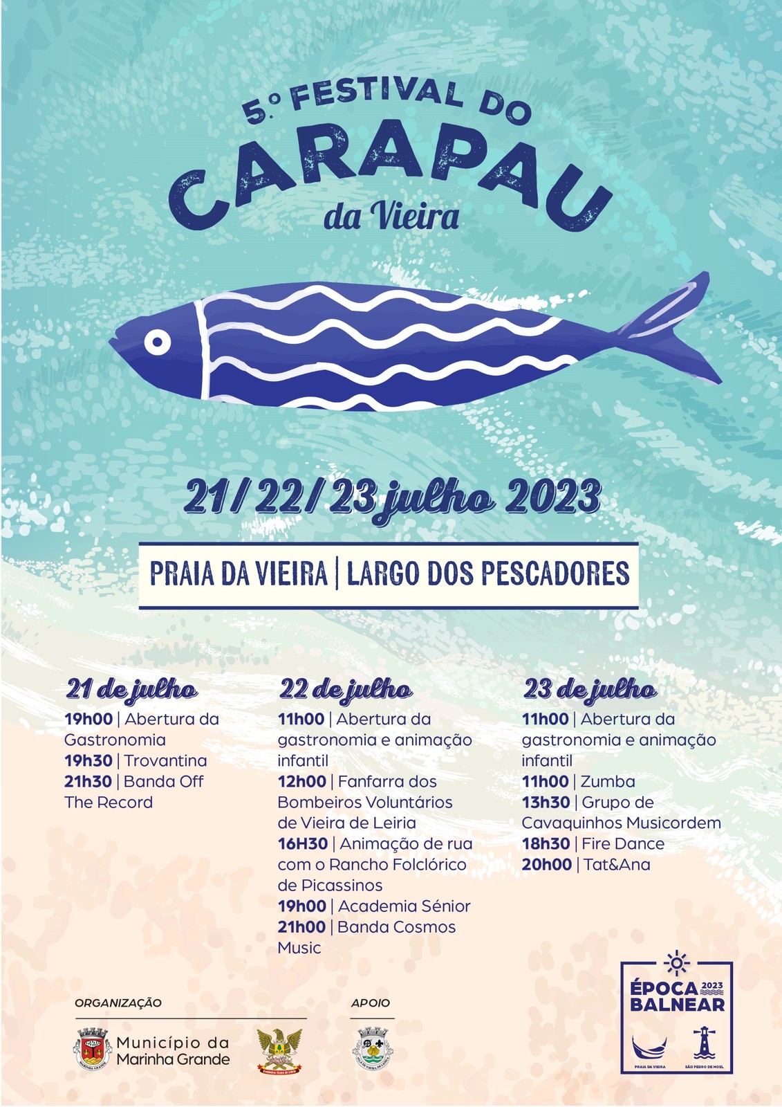 A Praia da Vieira, no concelho da Marinha Grande, recebe o Festival do Carapau nos próximos dias 21, 22 e 23 de julho, no Largo dos Pescadores, apresentando gastronomia local e animação cultural.