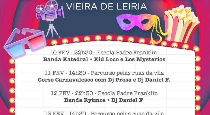 São esperados mais de 500 figurantes e vários carros alegóricos nos desfiles do Carnaval da Vieira 2024 que, este ano, é inspirado no tema “Cinema” e que vai decorrer de 10 a 13 de fevereiro, sob organização da Associação “AlóédaVieira” e do Município da Marinha Grande, com o apoio da Junta de Freguesia de Vieira de Leiria.