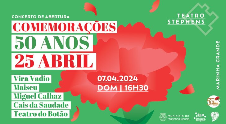 O Teatro Stephens, na Marinha Grande, é palco do espetáculo comemorativo dos 50 anos do 25 de Abril, no dia 7 de abril, pelas 16h30, cuja entrada é gratuita.