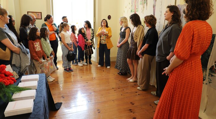 A técnica do Museu, Cátia Cavaco, e seis dos oito artistas, explicaram o âmbito da exposição, que está patente desde o dia 1 de dezembro e que agora finda, bem como as oficinas pedagógicas, realizadas nos Museus da Marinha Grande, durante a semana passada, que envolveram escolas do concelho e utentes da APPACDM e resultaram na instalação “Uma floresta de tecido”.
