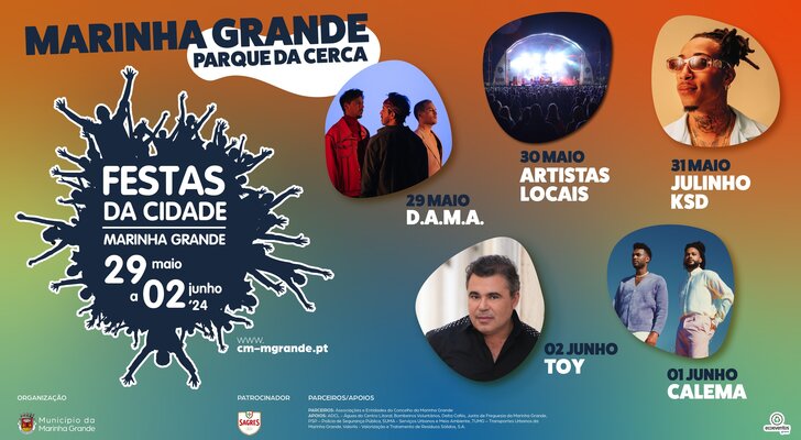 O bonito Parque da Cerca, situado no coração da Marinha Grande, recebe as Festas da Cidade, de 29 de maio a 2 de junho, numa edição que, este ano, o Município alargou de três para cinco dias, com um cartaz que inclui mais de 40 atuações distribuída pelos dois palcos, atividades infantis e radicais, jogos tradicionais e ações de sensibilização ambiental, cuja entrada é livre.