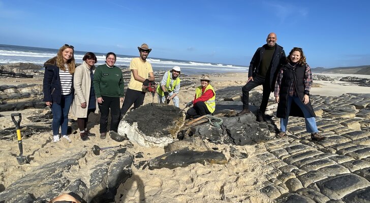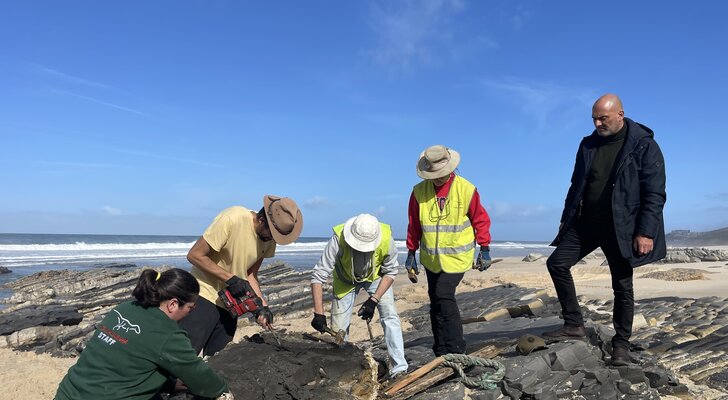 A tarefa foi muito desafiante por ser condicionada pelas marés, estado do mar e acesso difícil a máquinas com capacidade para transportar o bloco de rocha com ossos fossilizados com cerca de 1200Kg e que os técnicos estimam ter mais de 190 milhões de anos.