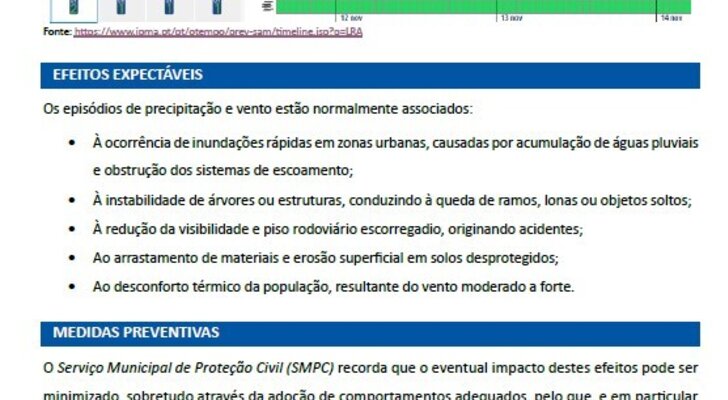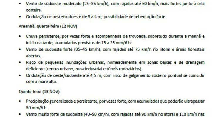 · Precipitação forte e persistente, entre as 09h00 de quarta-feira (12 NOV) e as 00h00 de sexta-feira (14 NOV);
